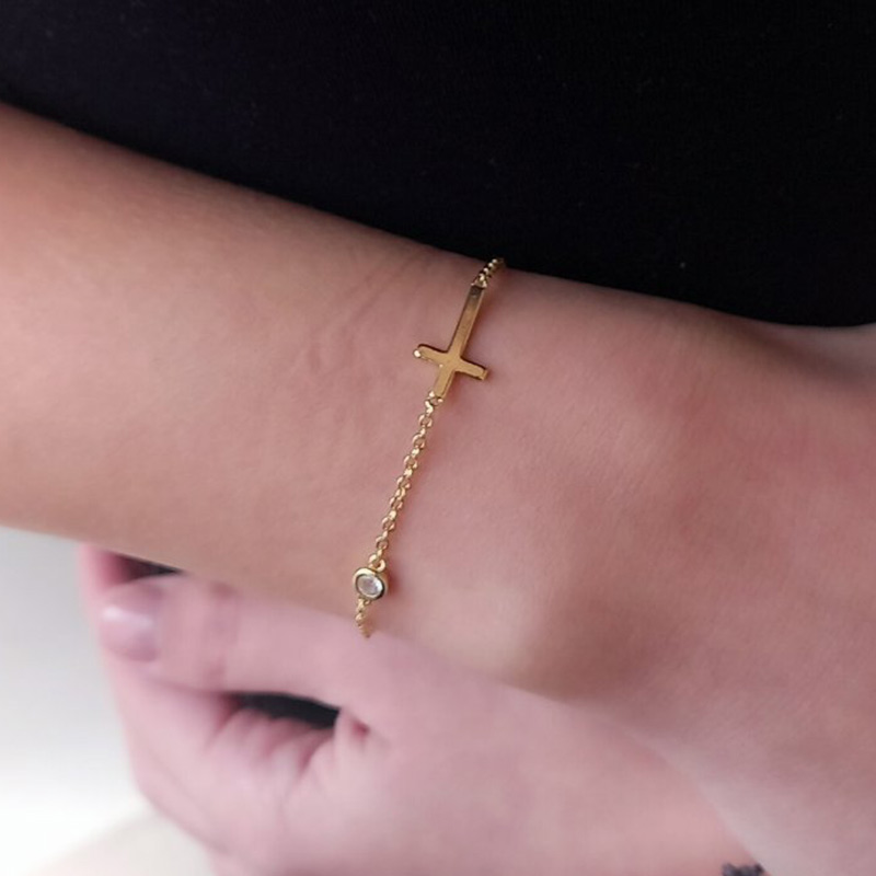 Βραχιόλι χεριού ατσάλινο, χρυσού χρώματος, σε αλυσίδα μήκους 20 cm, η οποία διακοσμείται με σταυρό και λευκό κρύσταλλο.