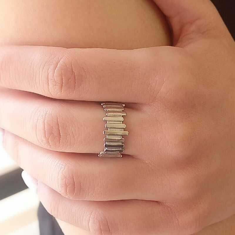 Δαχτυλίδι ατσάλινο ασημί χρώματος, με κάθετες μπάρες συνολικού μήκους 0,8 cm. Προσαρμόζεται στο μέγεθος του δακτύλου.