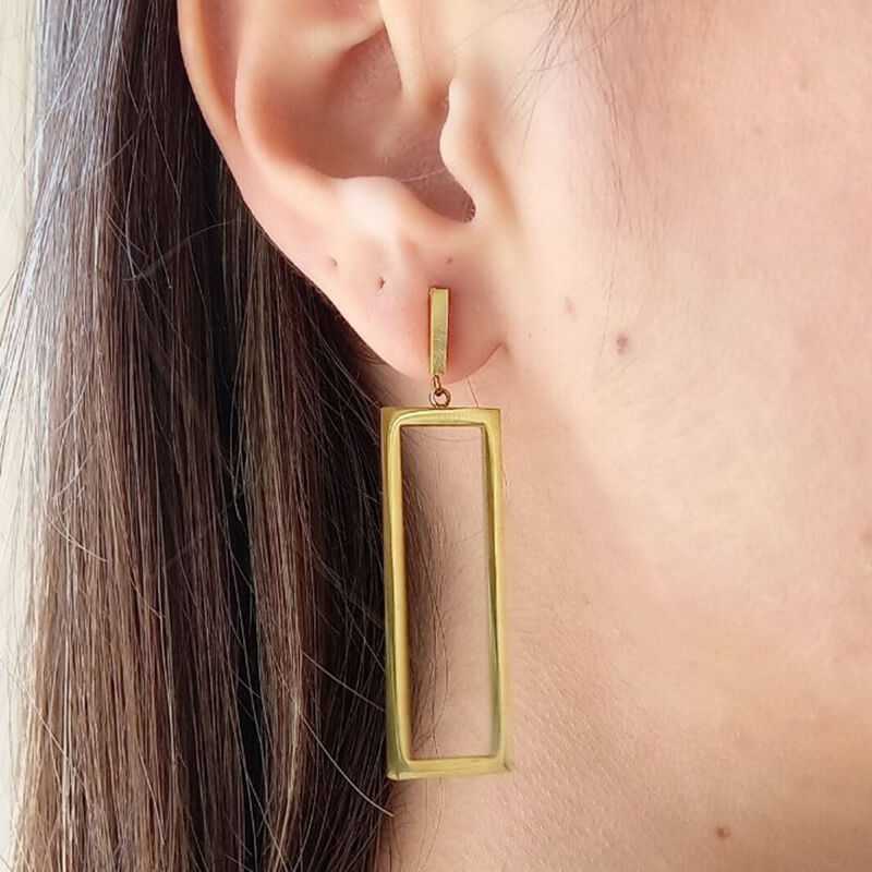Σκουλαρίκια ατσάλινα, χρυσού χρώματος, συνολικού μήκους 5,5 cm, μιας κάθετης μπάρας η οποία συγκρατεί ορθογώνιο στοιχείο διαστάσεων 1,5 cm x 4,00 cm.