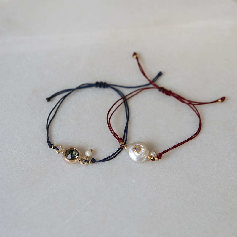 Set βραχιολιών χεριού, ethnic style. Αποτελείται από ένα βραχιόλι χεριού μακραμέ σε μπορντώ χρώμα, διακοσμημένο με μαργαριτάρι που έχει ματάκι με strass στο κέντρο του και κρεμαστή πέρλα. Συνοδεύεται από ένα δεύτερο βραχιόλι χεριού μακραμέ σε μπλε χρώμα, διακοσμημένο με στοιχείο επιχρυσωμένου ορείχαλκου, κρύσταλλο μπλε χρώματος και κρεμαστή πέρλα.