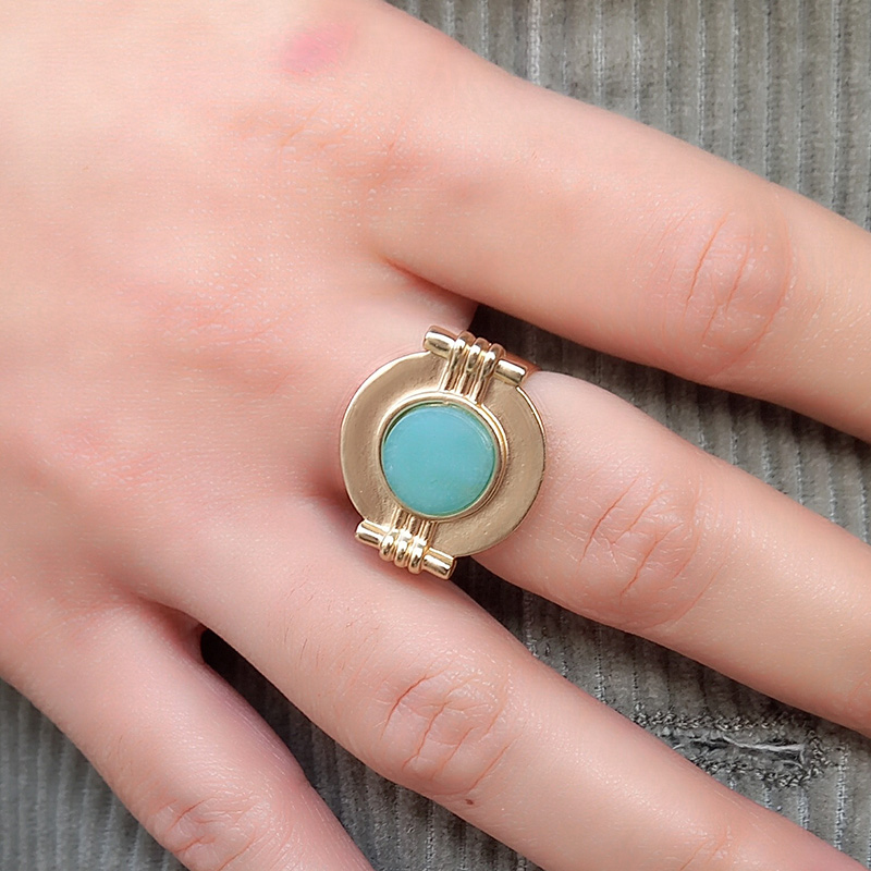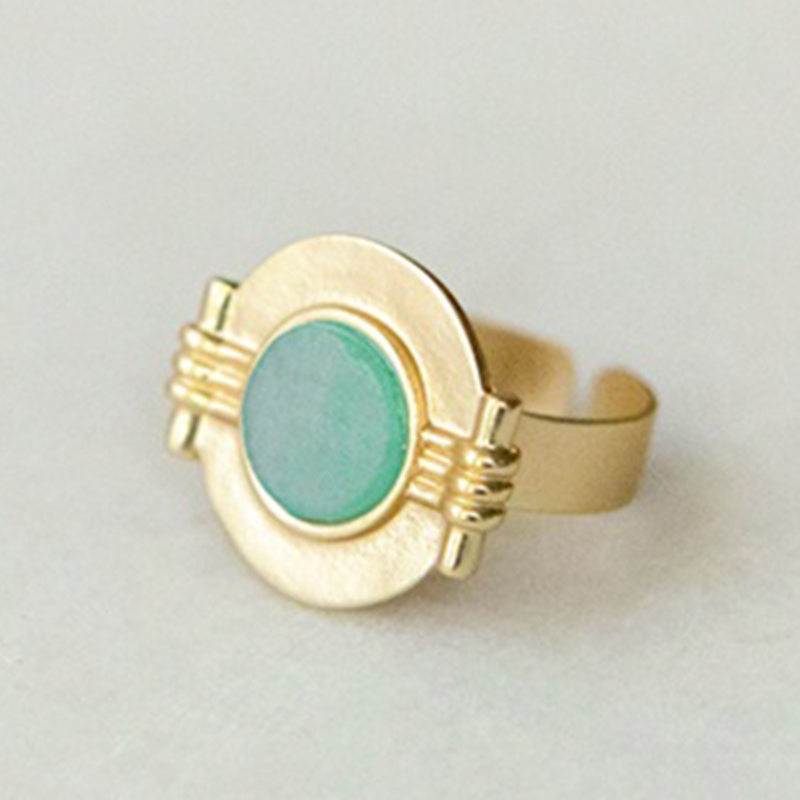 Δαχτυλίδι επιχρυσωμένου ορείχαλκου, σε χρυσό χρώμα ματ απόχρωσης διακριτικής χάραξης, διακοσμημένο με τυρκουάζ γυαλί, το οποίο προσαρμόζεται στο μέγεθος του δακτύλου.