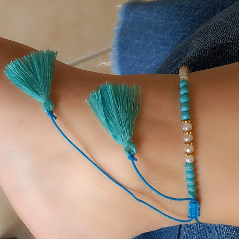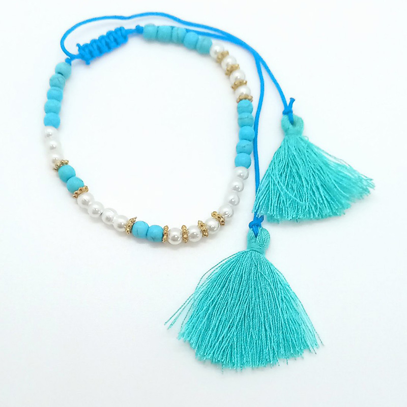 Βραχιόλι ποδιού μακραμέ, διακοσμημένο με τυρκουάζ χάντρες και λευκές πέρλες, ενώ στο τελείωμά του έχει τυρκουάζ φούντες.