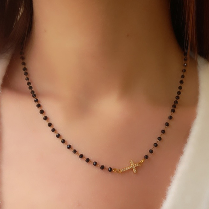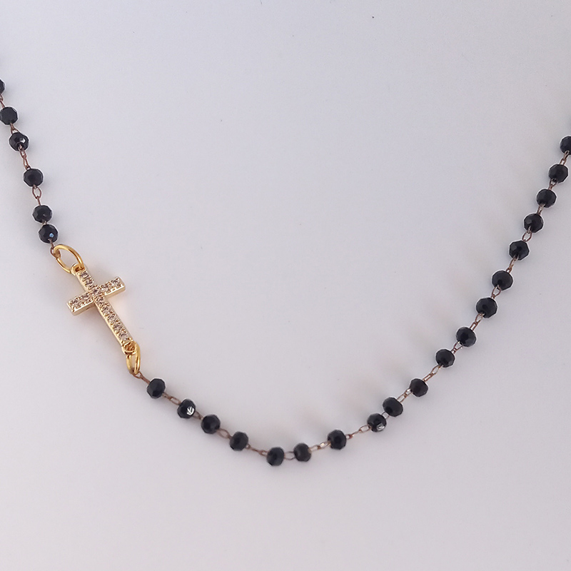 Κολιέ από αλυσίδα τύπου ροζάριο, χρώματος μαύρου και μήκους 50cm, διακοσμημένο με επιχρυσωμένο ορείχαλκο σταυρό με strass.