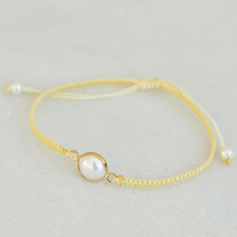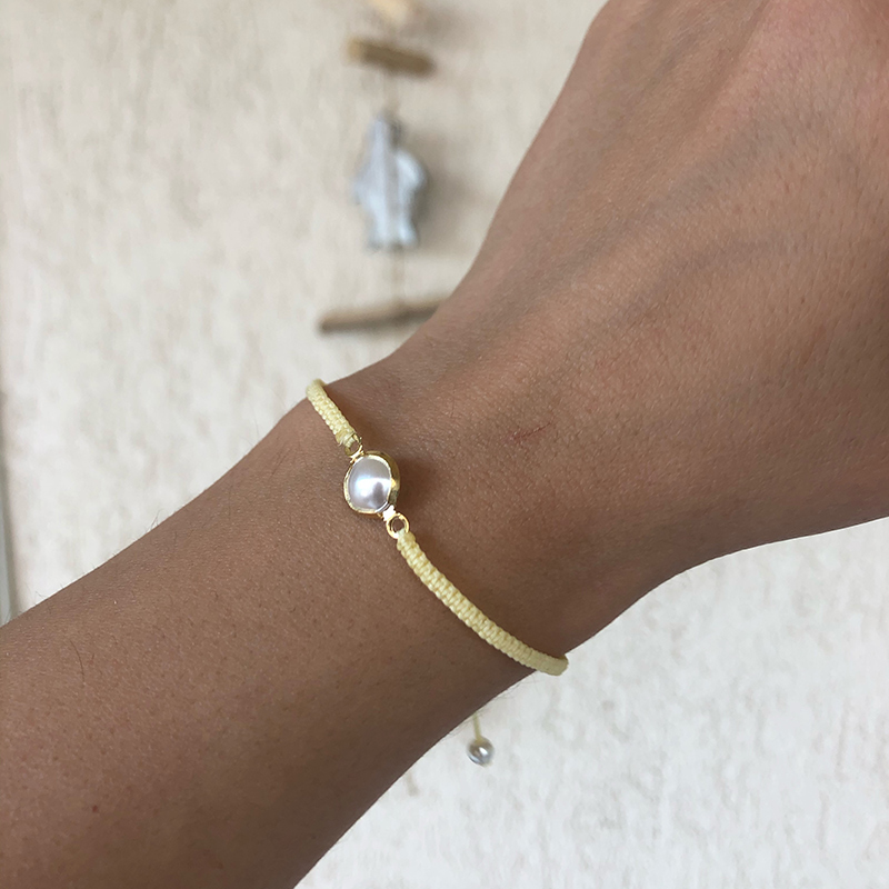 Βραχιόλι χεριού μακραμέ μπεζ χρώματος, διακοσμημένο με στοιχείο πέρλας.