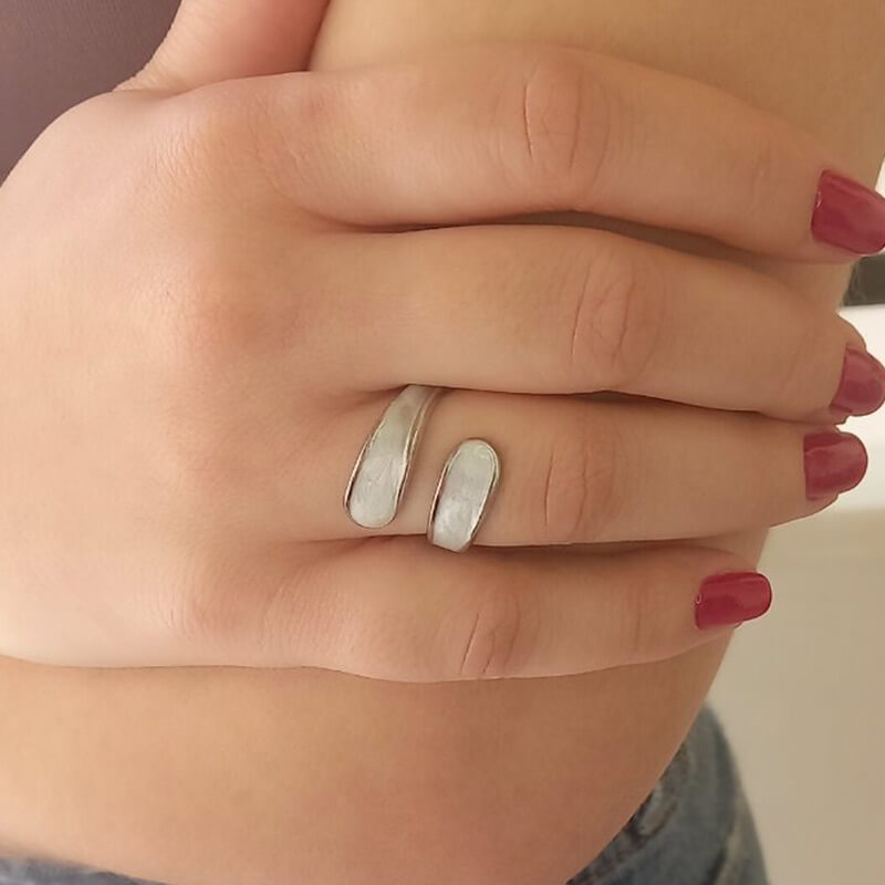 Δαχτυλίδι ατσάλινο ασημί χρώματος, διακοσμημένο με δύο κύματα διαμέτρου 0,7 cm το καθένα λευκού σμάλτου. Προσαρμόζεται στο μέγεθος του δακτύλου.