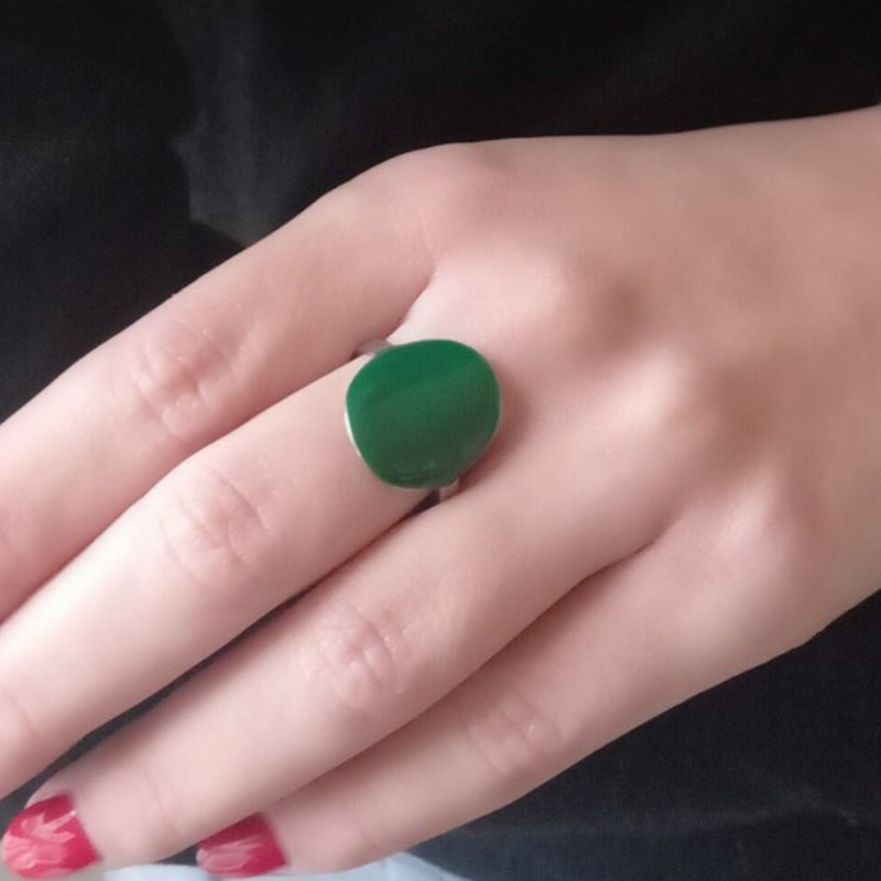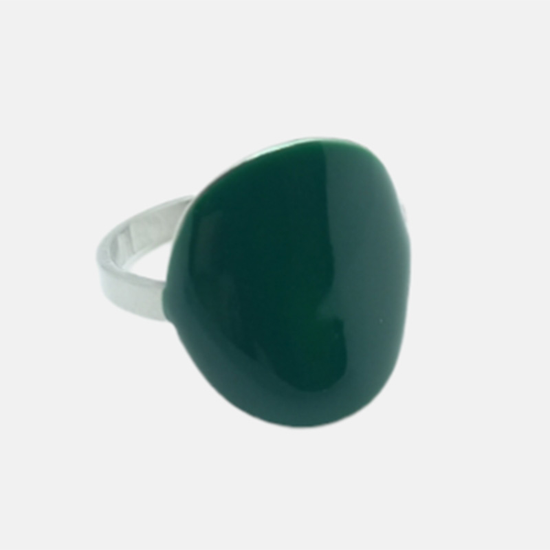 Δαχτυλίδι ατσάλινο ασημί χρώματος, διακοσμημένο με πράσινο θερμό σμάλτο σε επιφάνεια 1,5 cm x 1,8 cm. Προσαρμόζεται στο μέγεθος του δακτύλου.