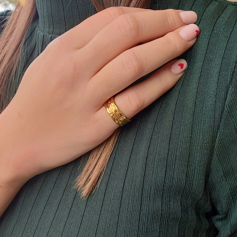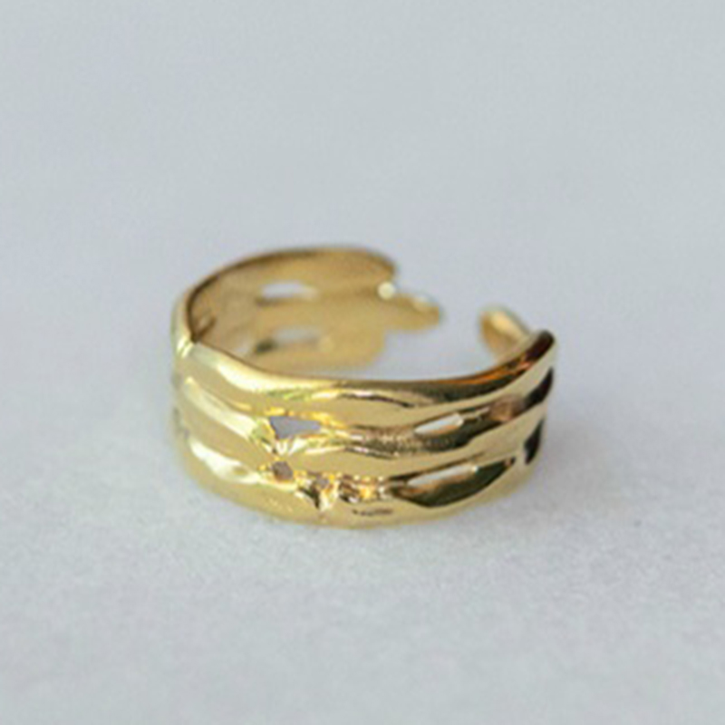 Δαχτυλίδι επιχρυσωμένου ορείχαλκου, διακοσμημένο με χάραξη σχεδίου κοραλλιού σε τρεις γραμμές, το οποίο προσαρμόζεται στο μέγεθος του δακτύλου.