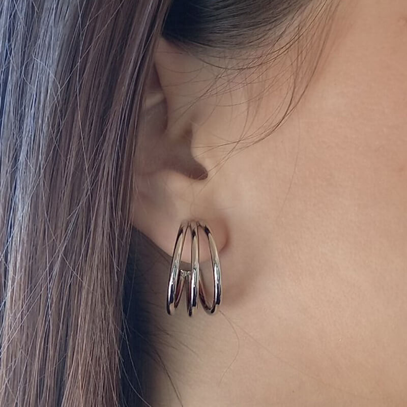 Σκουλαρίκια ατσάλινα ασημί χρώματος, σε σχηματισμό τριπλών κλασικών κρίκων διαμέτρου 2,3 cm. Διαθέτουν κούμπωμα “καρφάκι”.