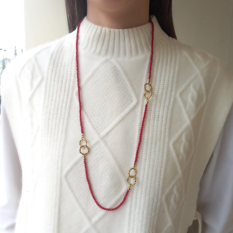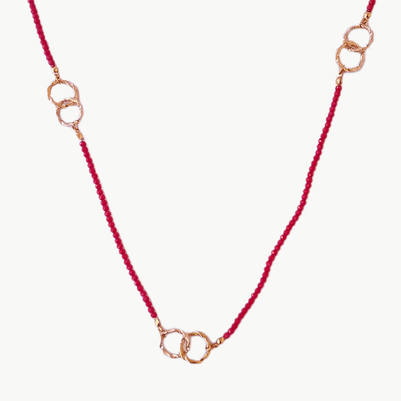Κολιέ ατσάλινο χρυσού χρώματος, σε αλυσίδα μήκους 90 cm, η οποία διακοσμείται από κόκκινους κρυστάλλους και ανά διαστήματα δύο επίχρυσους σφυρήλατους ατσάλινους κρίκους.