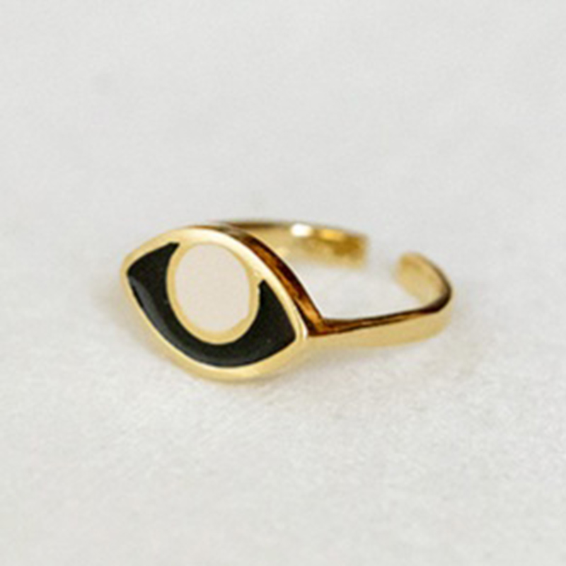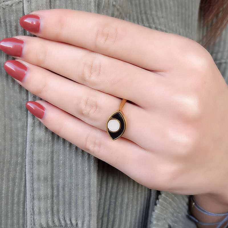 Δαχτυλίδι επιχρυσωμένου ορείχαλκου, με διακόσμηση σχήματος ματιού μαύρου – λευκού σμάλτου, το οποίο προσαρμόζεται στο μέγεθος του δακτύλου.