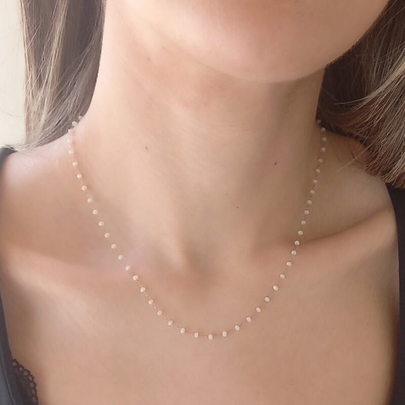 Κολιέ ροζάριο, σε λευκό χρώμα, σε ατσάλινη αλυσίδα χρυσού χρώματος, συνολικού μήκους 45 cm.