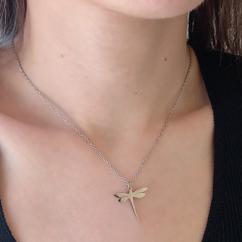 Κολιέ ατσάλινο ασημί χρώματος, σε αλυσίδα κλασικού μοτίφ, συνολικού μήκους 45 cm, η οποία συγκρατεί στοιχείο “λιβελούλα” διαστάσεων 2 cm x 2,5 cm.