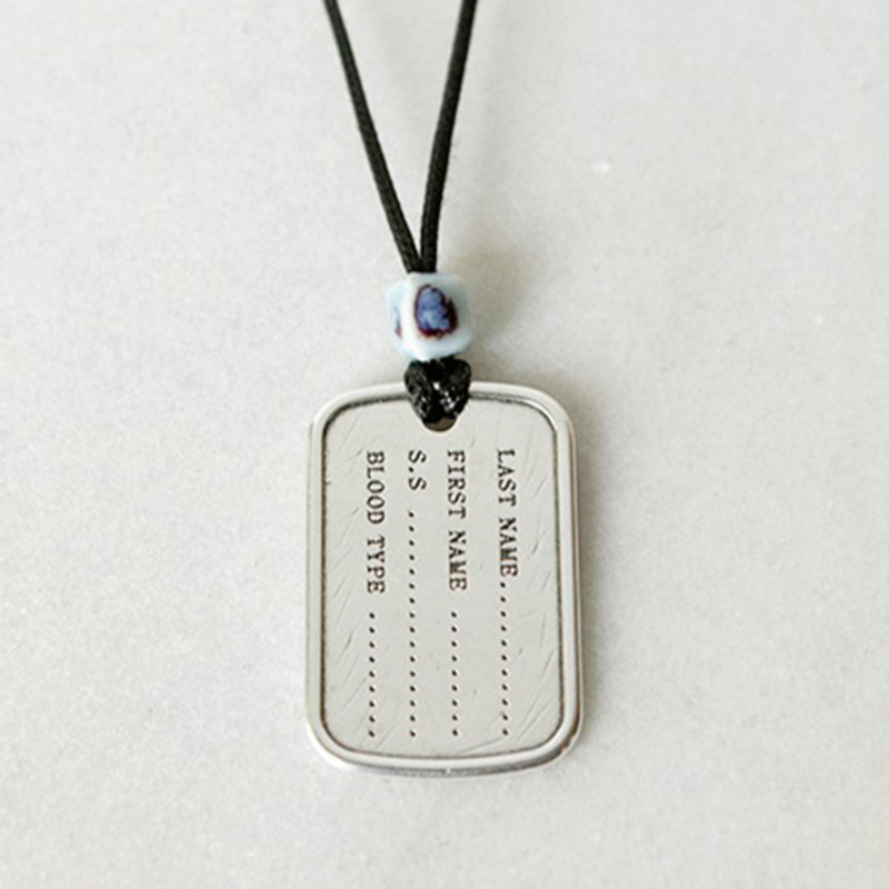 Κολιέ με μαύρη κηροκλωστή, με μηχανισμό ρύθμισης του μήκους των 96cm, η οποία στο τελείωμά της διαθέτει γαλάζια κεραμική χάντρα και συγκρατεί επαργυρωμένο στοιχείο ορείχαλκου military ταυτότητας διαστάσεων 4cmx2,3cm.