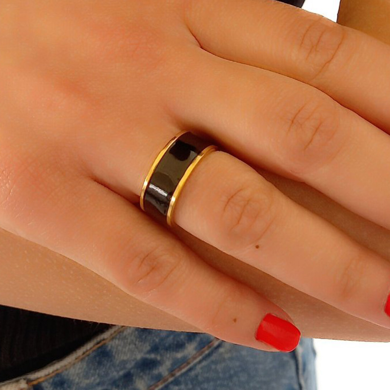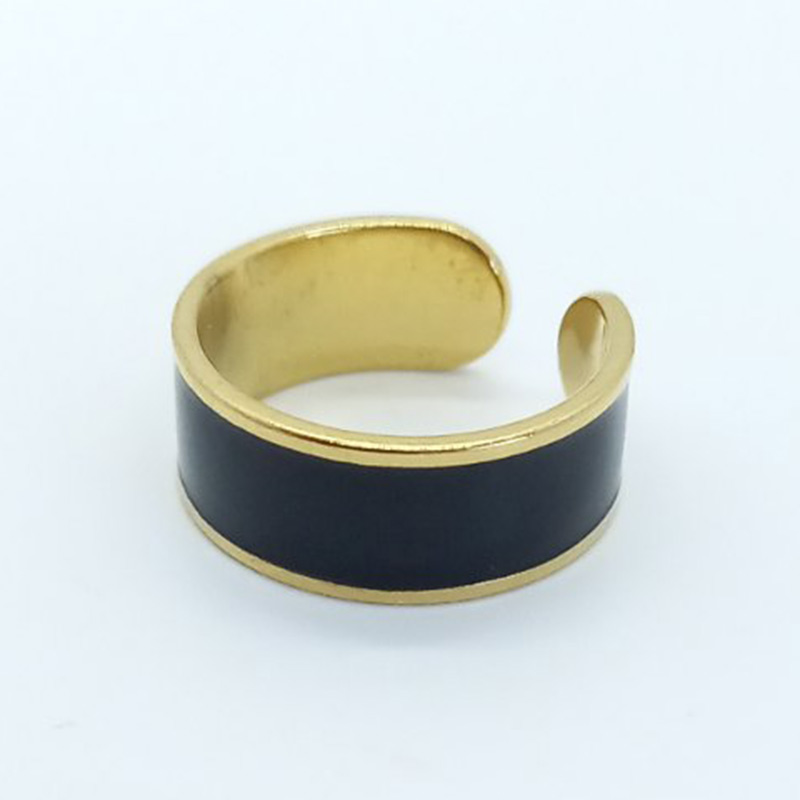 Δαχτυλίδι ατσάλινο χρυσού χρώματος, τύπου “βέρας”, πλάτους 0,8 cm, διακοσμημένο με μαύρο σμάλτο. Προσαρμόζεται στο μέγεθος του δακτύλου.