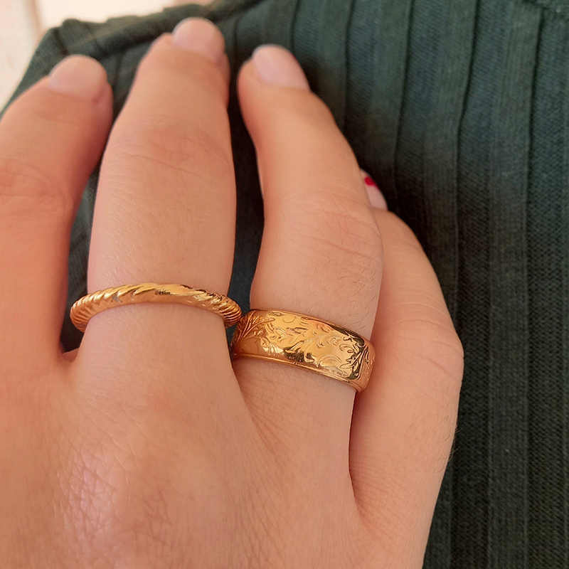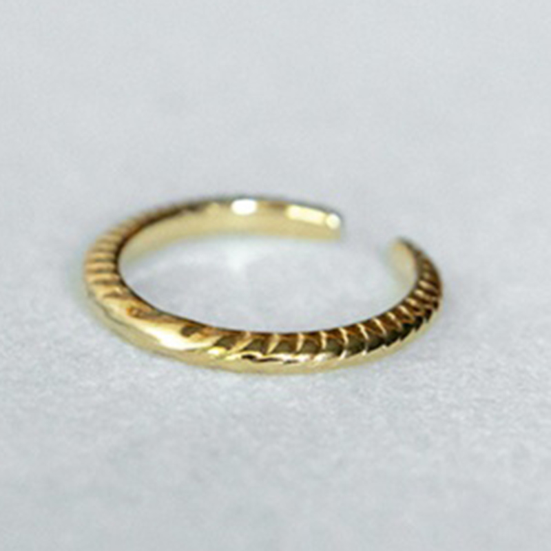 Δαχτυλίδι επιχρυσωμένου ορείχαλκου, τύπου βέρας, με χαραγμένες παράλληλες γραμμές, το οποίο προσαρμόζεται στο μέγεθος του δακτύλου.