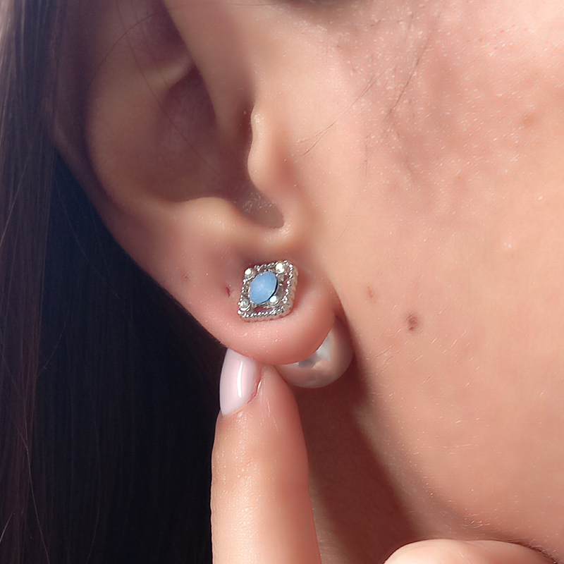 Σκουλαρίκια επαργυρωμένου ορείχαλκου, σε σχήμα ρόμβου με strass στο περίγραμμά του και σιελ κρύσταλλο στο κέντρο για το μπροστινό μέρος του λοβού. Έντονη πέρλα για το πίσω μέρος ως κούμπωμα.