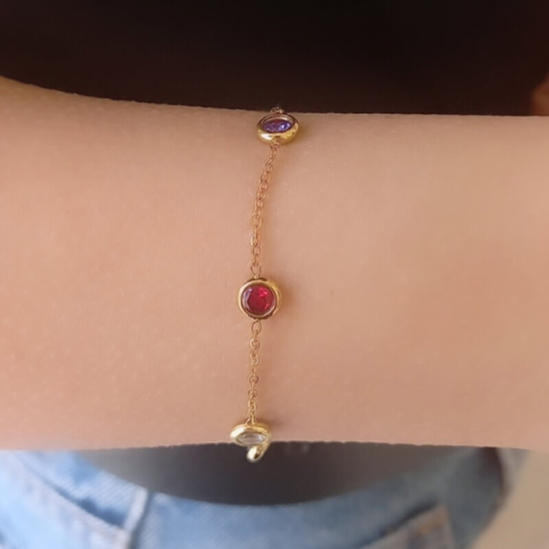 Βραχιόλι χεριού ατσάλινο, χρυσού χρώματος, με αλυσίδα  μήκους 22 cm, η οποία συγκρατεί κρυσταλλάκια διαφόρων χρωμάτων διαμέτρου 0,5 cm.