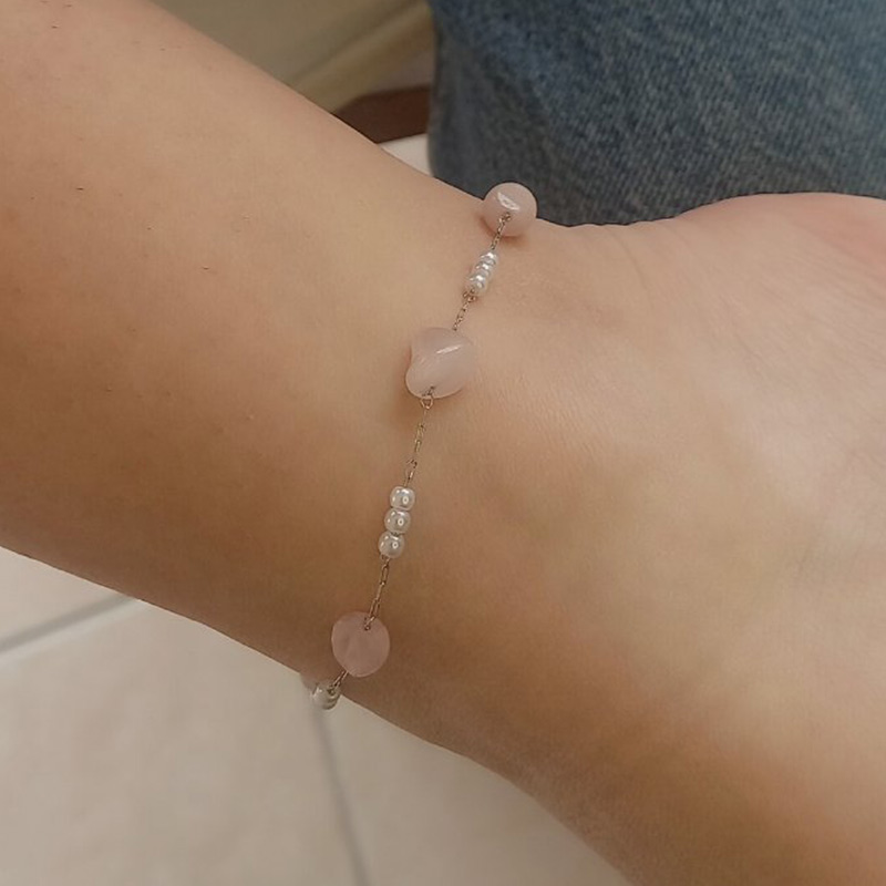Βραχιόλι ποδιού από ατσάλι, ασημί χρώματος, σε αλυσίδα μήκους 27 cm, διακοσμημένη με στοιχεία ροζ χαλαζία και πέρλες.