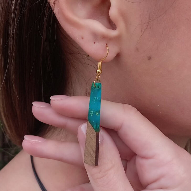 Σκουλαρίκια κρεμαστά plexiglass με συνδυασμό ξύλου, σε συνδυασμό τυρκουάζ και καφέ χρώματος, μήκους 6,5 cm και πλάτους 0,7 cm.