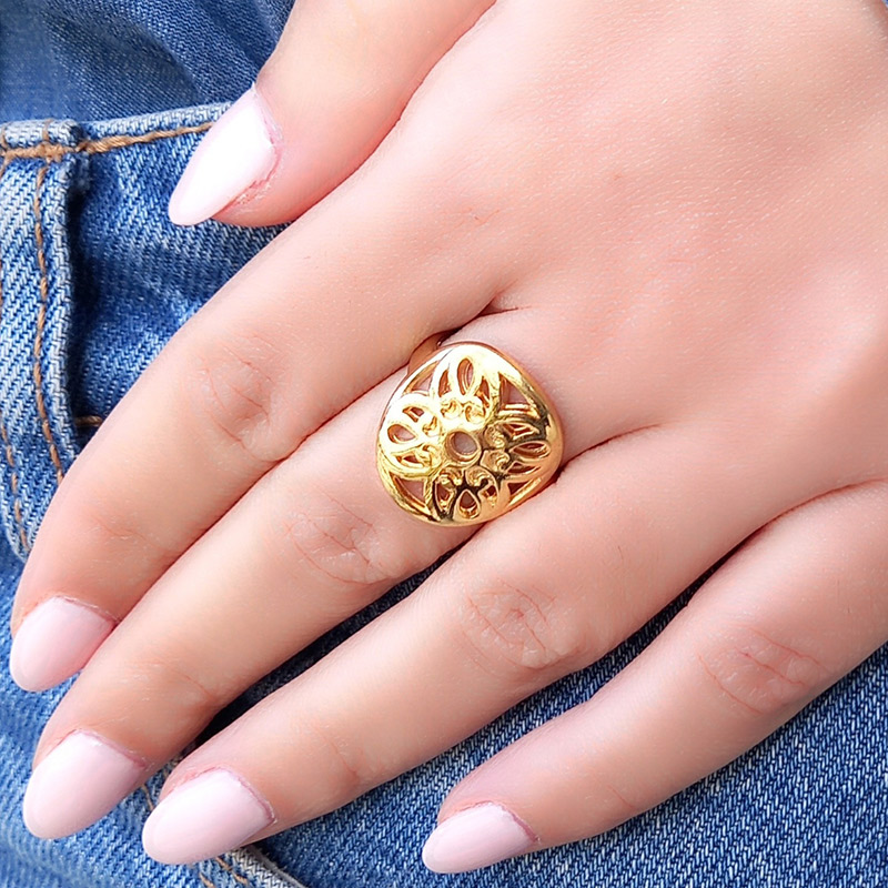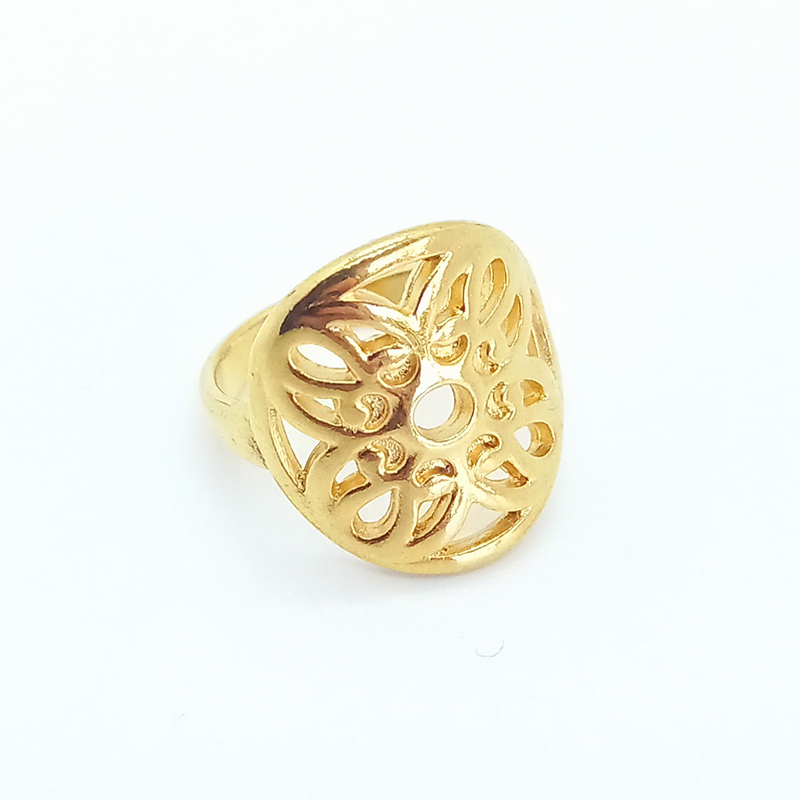 Δαχτυλίδι επιχρυσωμένου ορείχαλκου, με διάτρητη διακόσμηση σε οβάλ σχήμα, διαμέτρου 2,5cm, το οποίο προσαρμόζεται στο μέγεθος του δακτύλου.
