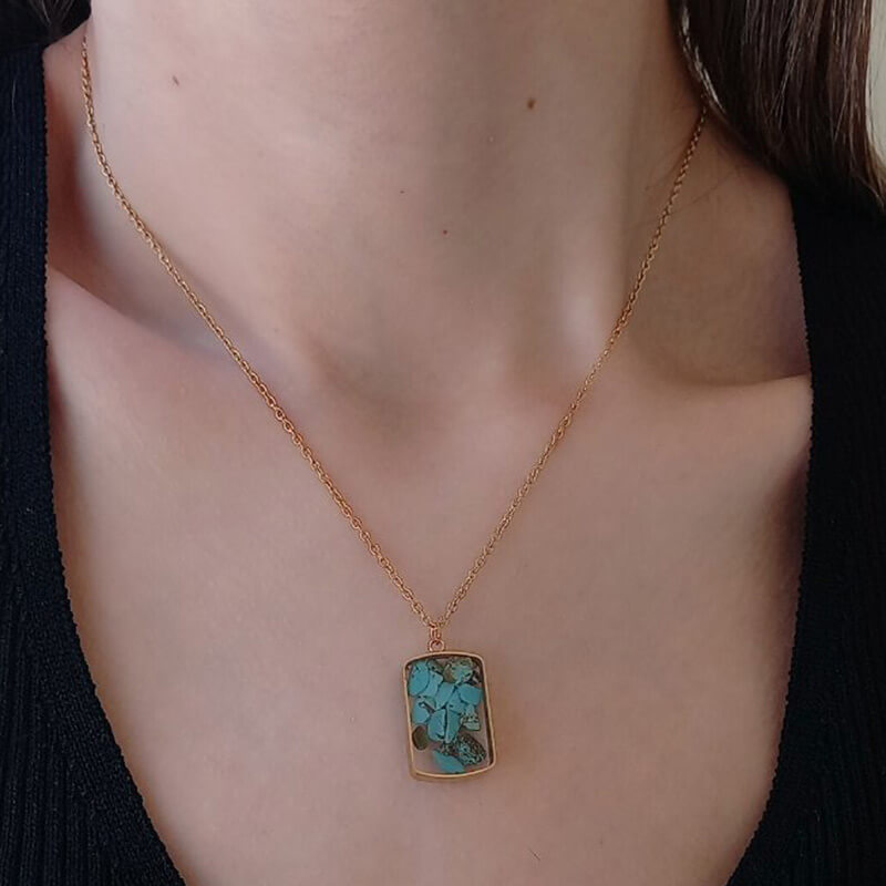 Κολιέ αλυσίδας από ατσάλι, χρυσού χρώματος, συνολικού μήκους 45 cm, η οποία συγκρατεί στοιχείο διαστάσεων 2 cm x 1,5 cm και περιέχει πέτρες χαολίτη καλυμμένες με διάφανη ρητίνη.