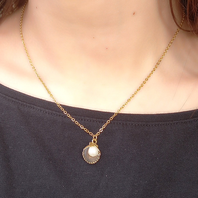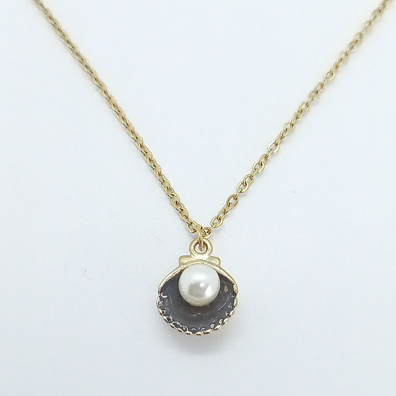 Κολιέ από ατσάλι σε χρώμα χρυσό, με αλυσίδα μήκους 45cm, η οποία συγκρατεί στοιχείο επιχρυσωμένου ορείχαλκου σε σχήμα ανοιγμένου κοχυλιού διαμέτρου 1 cm, το οποίο διακοσμείται με λευκή πέρλα σε μαύρο φόντο ψημένου σμάλτου.
