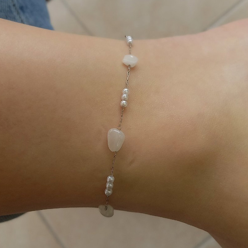 Βραχιόλι ποδιού από ατσάλι, σε αλυσίδα ασημί χρώματος, μήκους 27 cm, διακοσμημένη με λευκό χαλαζία και περλάκια.