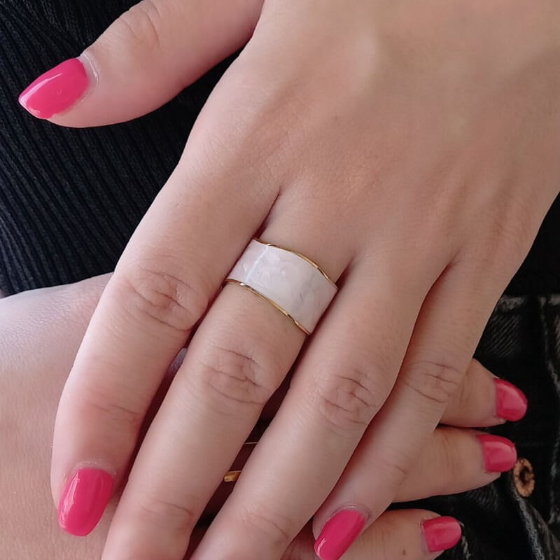 Δαχτυλίδι ατσάλινο χρυσού χρώματος, το οποίο διακοσμείται με ροζ σμάλτο πάχους 1,00 cm. Προσαρμόζεται στο μέγεθος του δακτύλου.