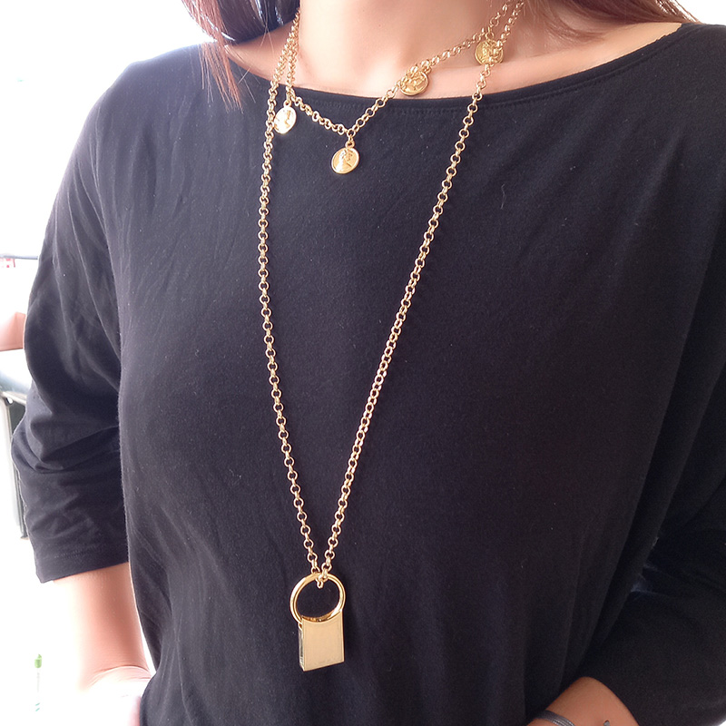 Set κολιέ επιχρυσωμένου ορείχαλκου, το οποίο αποτελείται από αλυσίδα μήκους 46cm, η οποία συγκρατεί τέσσερα στοιχεία τύπου φλουριών και από αλυσίδα μήκους 80cm, η οποία συγκρατεί στοιχείο από ανοιγόμενο λουκέτο.