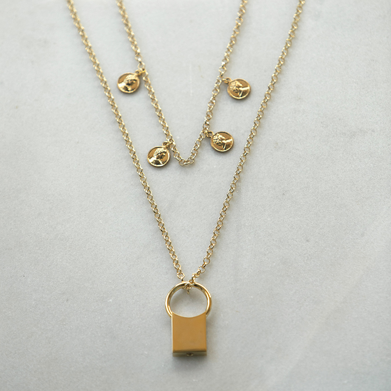 Set κολιέ επιχρυσωμένου ορείχαλκου, δύο αλυσίδες οι οποίες συγκρατούν φλουριά και λουκέτο.