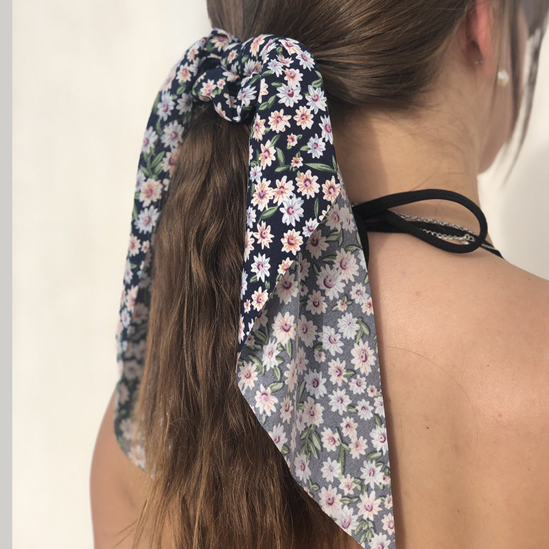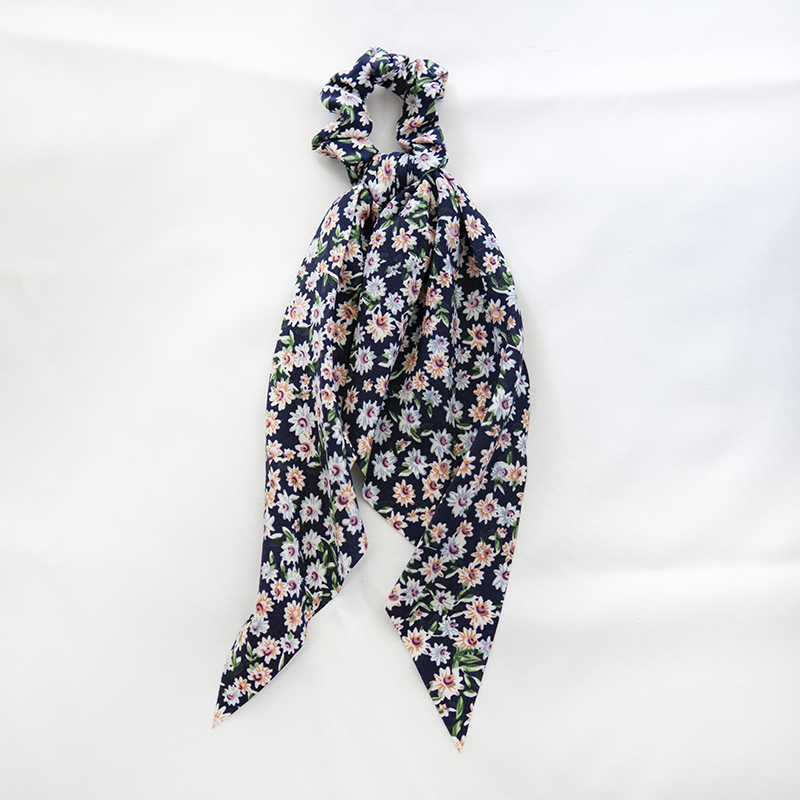 Scrunchie μαλλιών με κορδέλα, floral, από ζορζέτα μπλε σκούρου χρωματισμού, διακοσμημένο με μαργαρίτες. Φοριούνται και χωριστά ή ως αξεσουάρ στο χέρι.