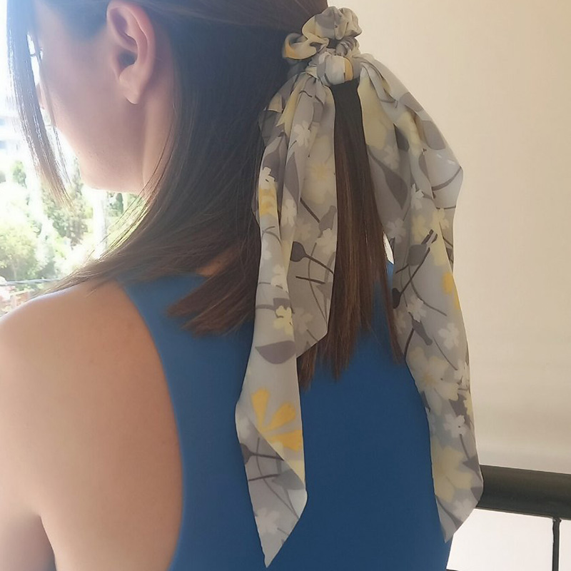 Scrunchie μαλλιών με κορδέλα, από ζορζέτα γκρι χρωματισμού σε floral pattern. Φοριούνται και χωριστά ή ως αξεσουάρ στο χέρι.