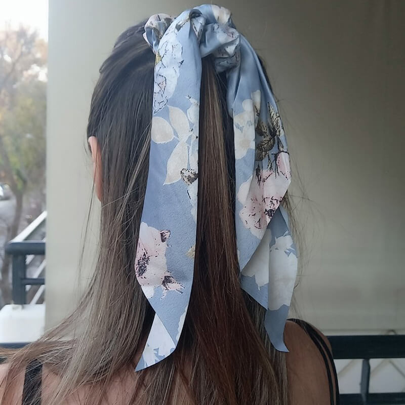 Scrunchies μαλλιών με κορδέλα, από satin ύφασμα γαλάζιου χρωματισμού floral. Φοριούνται και χωριστά ή ως αξεσουάρ στο χέρι.