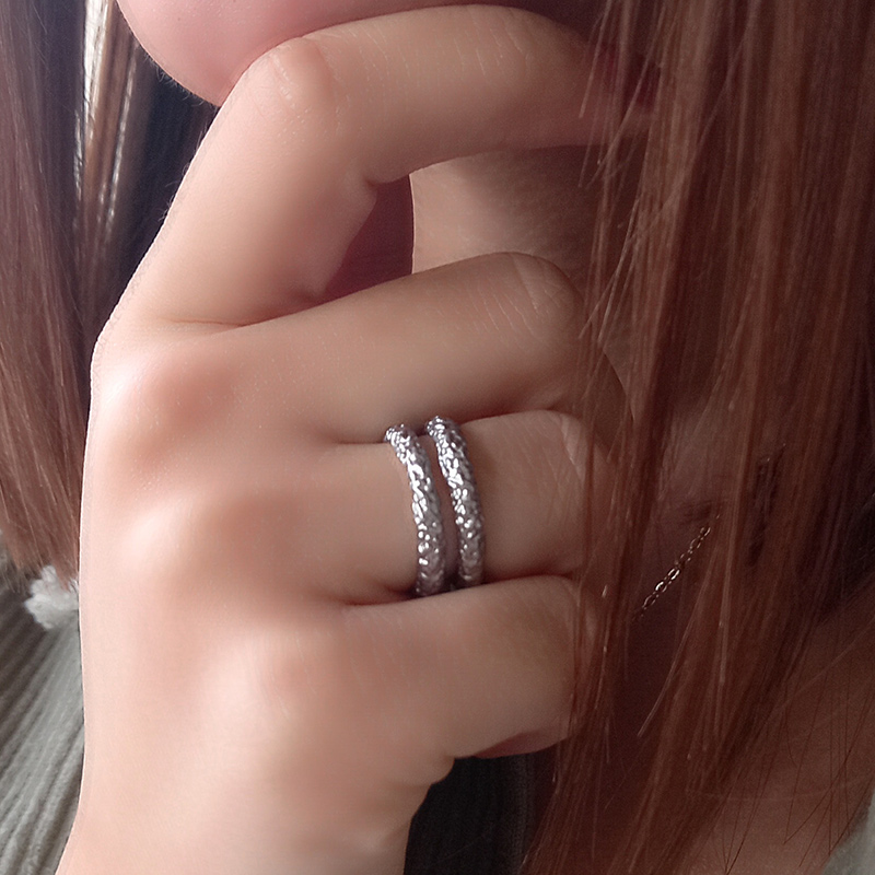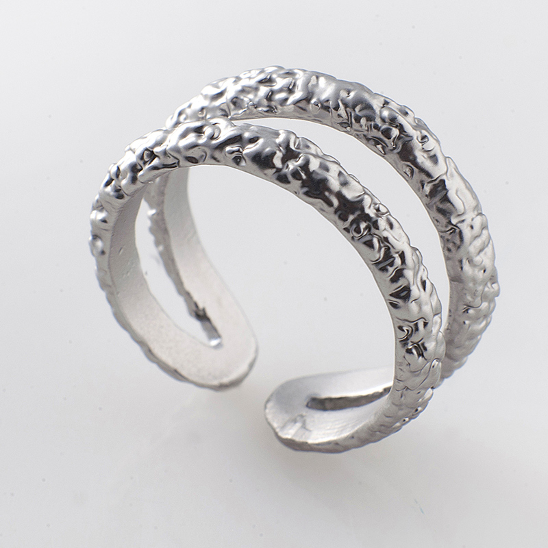 Δαχτυλίδι επαργυρωμένου ορείχαλκου, σε ματ απόχρωση ασημί χρώματος, σφυρήλατο, το οποίο προσαρμόζεται στο μέγεθος του δακτύλου.