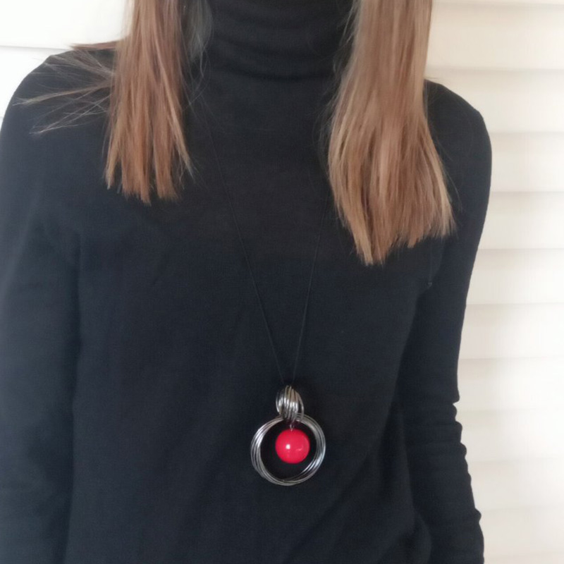 Κολιέ από κορδόνι μαύρου χρώματος, αυξομειώνεται στο μάκρος του με μέγιστο τα 70 cm, και συγκρατεί στοιχείο επαργυρωμένου ορείχαλκου με δέκα κρίκους διαμέτρου 3 cm , από τους οποίους κρέμονται ακόμα δέκα κρίκοι, διαμέτρου 5 cm και στο κέντρο τους κόκκινη ακρυλική χάντρα διαμέτρου 2,5 cm.