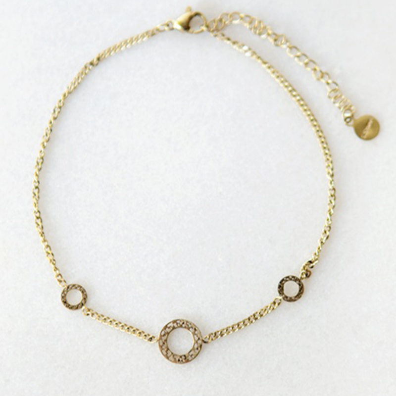 Βραχιόλι ποδιού από ατσάλι σε χρυσό χρώμα, με προέκταση συνολικού μήκους 28cm σε κλασικό μοτίφ με διακόσμηση τριών διάτρητων κύκλων.