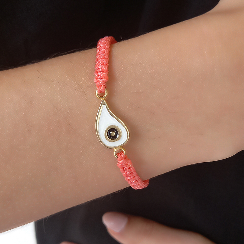 Βραχιόλι χεριού μακραμέ σε κοραλλί χρώμα, διακοσμημένο με στοιχείο επιχρυσωμένου ορείχαλκου το οποίο απεικονίζει μάτι και πέρλες.