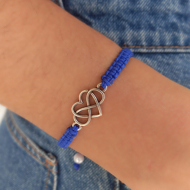 Βραχιόλι χεριού μακραμέ σε μπλε χρώμα, διακοσμημένο με στοιχείο επαργυρωμένου ορείχαλκου σε σχήμα καρδιάς.