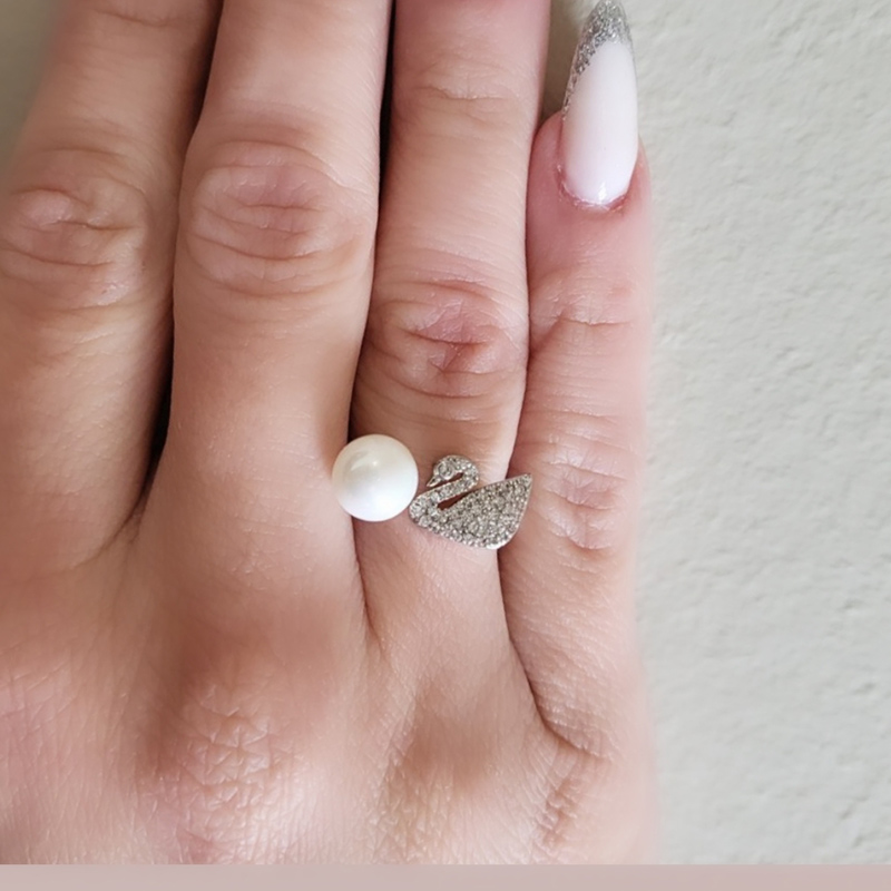 Δαχτυλίδι επαργυρωμένου ορείχαλκου, το οποίο στην κατάληξή του απεικονίζει κύκνο διακοσμημένο με strass και λευκή πέρλα. Προσαρμόζεται στο μέγεθος του δακτύλου.