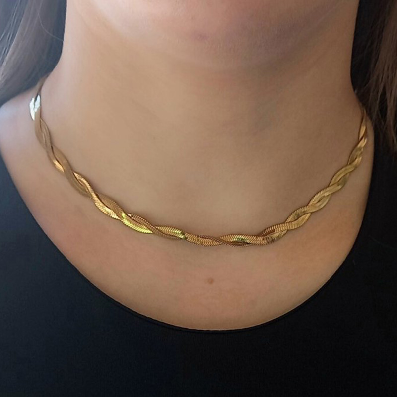 Κολιέ από ατσάλι, χρυσού χρώματος, διπλής στριφτής αλυσίδας σε μοτίφ “φιδιού”, συνολικού μήκους 46 cm και πάχους 0,5 cm. Φοριέται και ως choker.