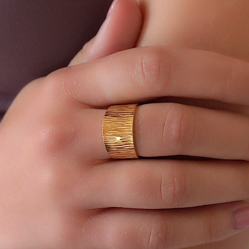 Δαχτυλίδι ατσάλινο χρυσού χρώματος, το οποίο σε επιφάνεια 1,3 cm διακοσμείται με διακριτική χάραξη. Προσαρμόζεται στο μέγεθος του δακτύλου.