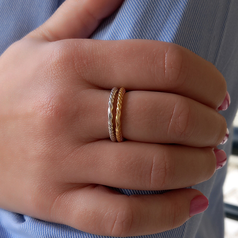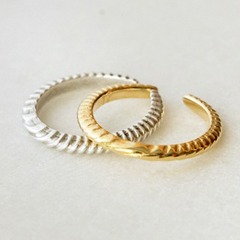 Set δαχτυλιδιών, τύπου βέρας με χαραγμένες παράλληλες γραμμές. Το καθένα από επαργυρωμένο και επιχρυσωμένο ορείχαλκο, τα οποία προσαρμόζονται στο μέγεθος του δακτύλου.