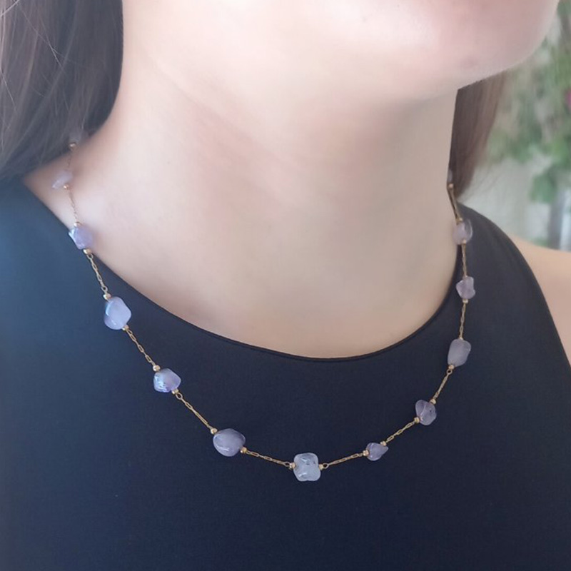 Κολιέ ατσάλινο χρυσού χρώματος, σε αλυσίδα μήκους 47 cm, η οποία διακοσμείται με πέτρες αμέθυστου σε ακανόνιστο σχήμα.