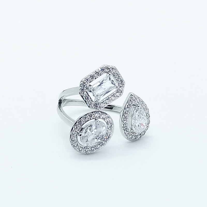 Δαχτυλίδι επαργυρωμένου ορείχαλκου, classic style, με τρία διαφορετικά σημεία διακοσμημένα με λευκά strass και κρύσταλλο, το οποίο προσαρμόζεται στο μέγεθος του δακτύλου.D