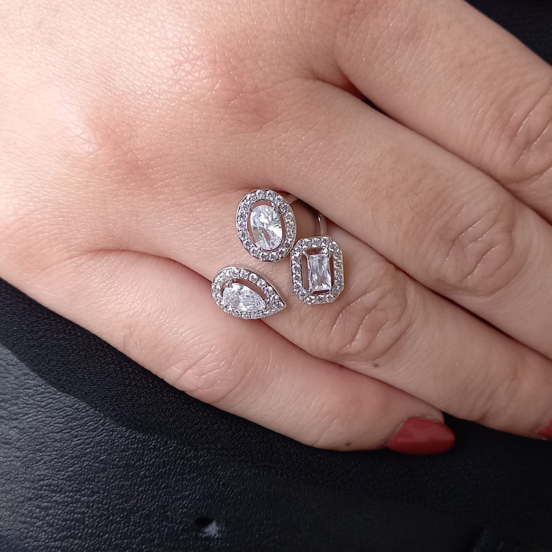 Δαχτυλίδι επαργυρωμένου ορείχαλκου, classic style, με τρία διαφορετικά σημεία διακοσμημένα με λευκά strass και κρύσταλλο, το οποίο προσαρμόζεται στο μέγεθος του δακτύλου.