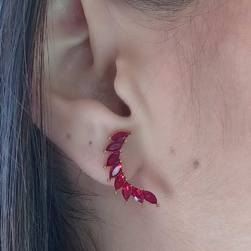 Σκουλαρίκια από ατσάλι χρυσού χρώματος, σε ημικύκλιο σχήμα, συνολικού μήκους 2,2 cm, τα οποία διακοσμούνται σε όλο το μήκους τους με κόκκινους κρυστάλλους. Διαθέτουν κούμπωμα “καρφάκι”.