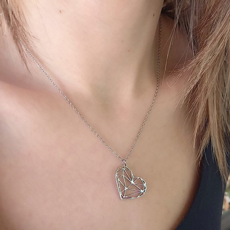 Κολιέ από ατσάλι, ασημί χρώματος, σε αλυσίδα μήκους 45 cm, η οποία συγκρατεί διάτρητο στοιχείο σε σχήμα καρδιάς διαστάσεων 2,5 cm x 2 cm.