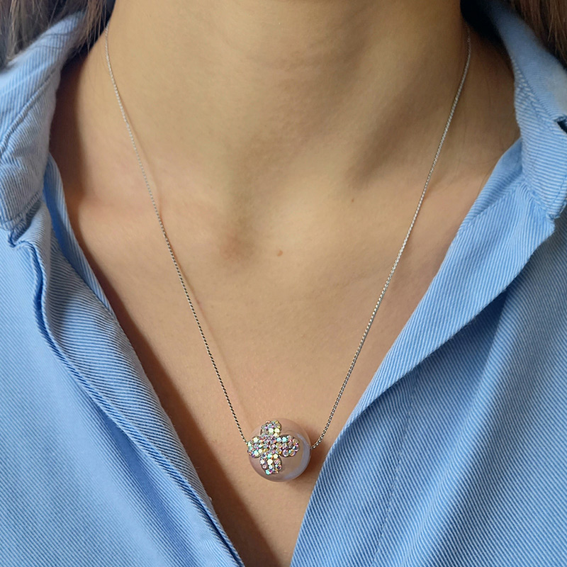 Κολιέ από ατσάλι σε ασημί χρώμα, σε αλυσίδα μήκους 50cm, η οποία συγκρατεί ακρυλική πέρλα σε ροζ χρώμα διακοσμημένη με strass που σχηματίζουν σταυρό.
