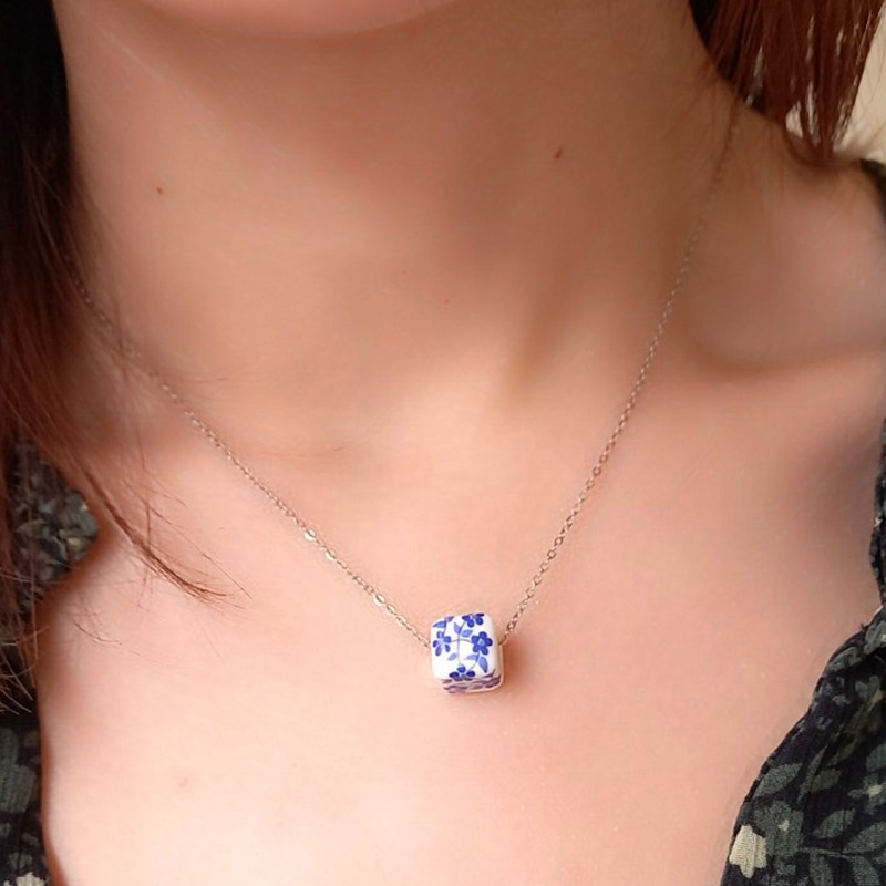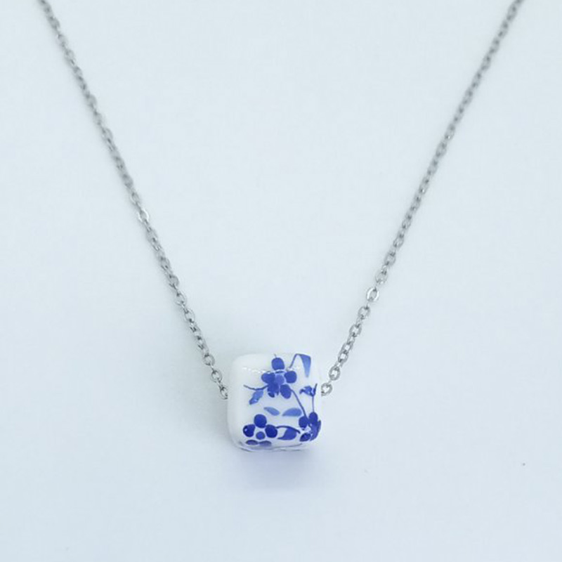 Κολιέ από ατσάλι σε ασημί χρώμα, σε αλυσίδα μήκους 45 cm, η οποία συγκρατεί κεραμική χάντρα σχήματος κύβου σε συνδυασμό λευκού φόντου και μπλε λουλουδιών.