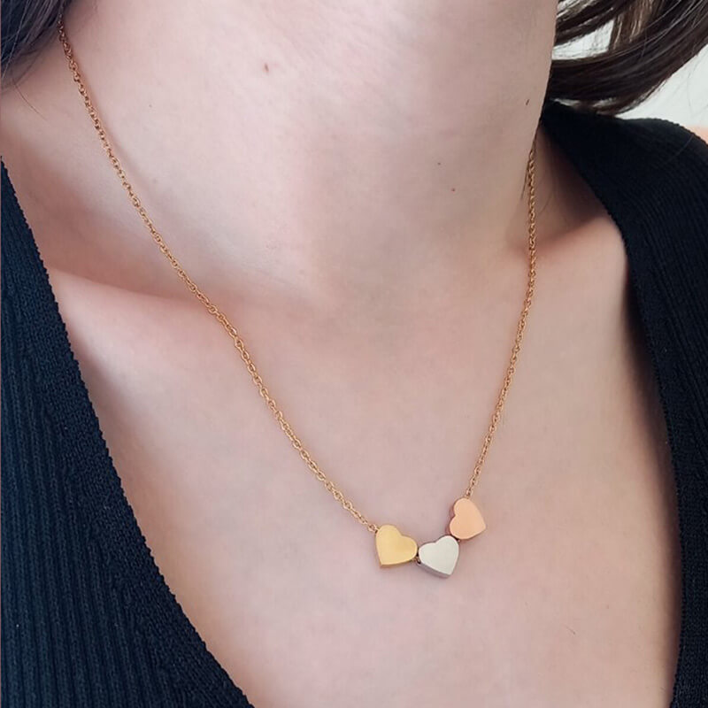 Κολιέ αλυσίδας από ατσάλι, χρυσού χρώματος, συνολικού μήκους 45 cm, η οποία συγκρατεί τρεις καρδιές διαμέτρου 0,7 cm, σε αποχρώσεις χρυσού, ασημί και ροζ χρυσού χρώματος.